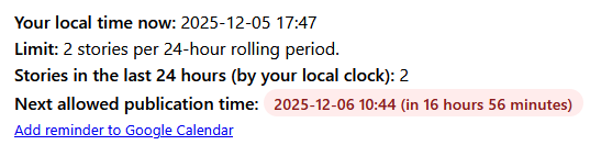 Set a reminder for the moment you can publish again — perfect for writers who plan ahead or manage multiple drafts.